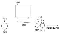 記録ヘッドカートリッジ1000は、インクを吐出するための複数の記録素子が図7の搬送方向と平行な方向に所定のピッチで配列されている記録ヘッドを有している。記録ヘッドカートリッジ1000は、図7の紙面に垂直な方向に移動走査しながら各記録素子よりインクを吐出し、搬送ローラ3060と排紙ローラ3100との間に位置している記録媒体2000の領域に対して、画像を形成する。このような記録ヘッドカートリッジ1000による記録走査と、3つのローラ対による記録媒体2000の搬送動作とを交互に繰り返すことにより、記録媒体2000に順次画像が形成されていく。