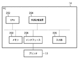図2は、PC14の構成を示すブロック図である。PC14は、CPU202と、メモリ203と、外部記憶装置204と、入力部205と、プリンタ13と接続するためのインタフェース206とを備える。