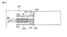 図40に示すように、冠動脈サポート312とグラフトサポート412は、冠動脈50やグラフト60を貫通した針14の先端部の内側に位置している。このため、冠動脈50やグラフト60を貫通した針14の先端部は、自然状態である湾曲した形状に戻ろうとするが、冠動脈サポート312とグラフトサポート412に当たり、元の湾曲した形状に戻る変形が冠動脈サポート312とグラフトサポート412によって邪魔される。つまり、ここでは、冠動脈サポート312とグラフトサポート412は、針14が元の湾曲した形状に戻る変形すなわち針14の復元を抑制する抑制部材として機能する。
