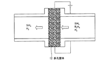 上記Si精製装置30では、図10に示すように、例えば、金属級Si等の低純度Si32から生成された水素化混合ガスは、下流側に設置された加熱された不純物除去用多孔質体34を通過することによって、ガス中に含有されるB2 H6 を除去することができる。不純物除去用多孔質体34を通過した後のガスを用いて成膜を行えば、用いた低純度Si32に比較して純度の高いSiを作製することができる。