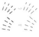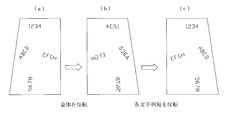 図7(a)に示される図形(文字形状も含まれる)を左右反転する場合には、まず、図7(a)の図形全体を左右反転して図7(b)に示されるような図形を描画する。そして、図7(b)に含まれる文字情報を文字列毎に反転する。この反転に際しては、図8に示されるように、各文字列をその並びの先端と末尾との間の中心を通る中心軸を軸にして反転させている。このようにして正像の文字が得られる。