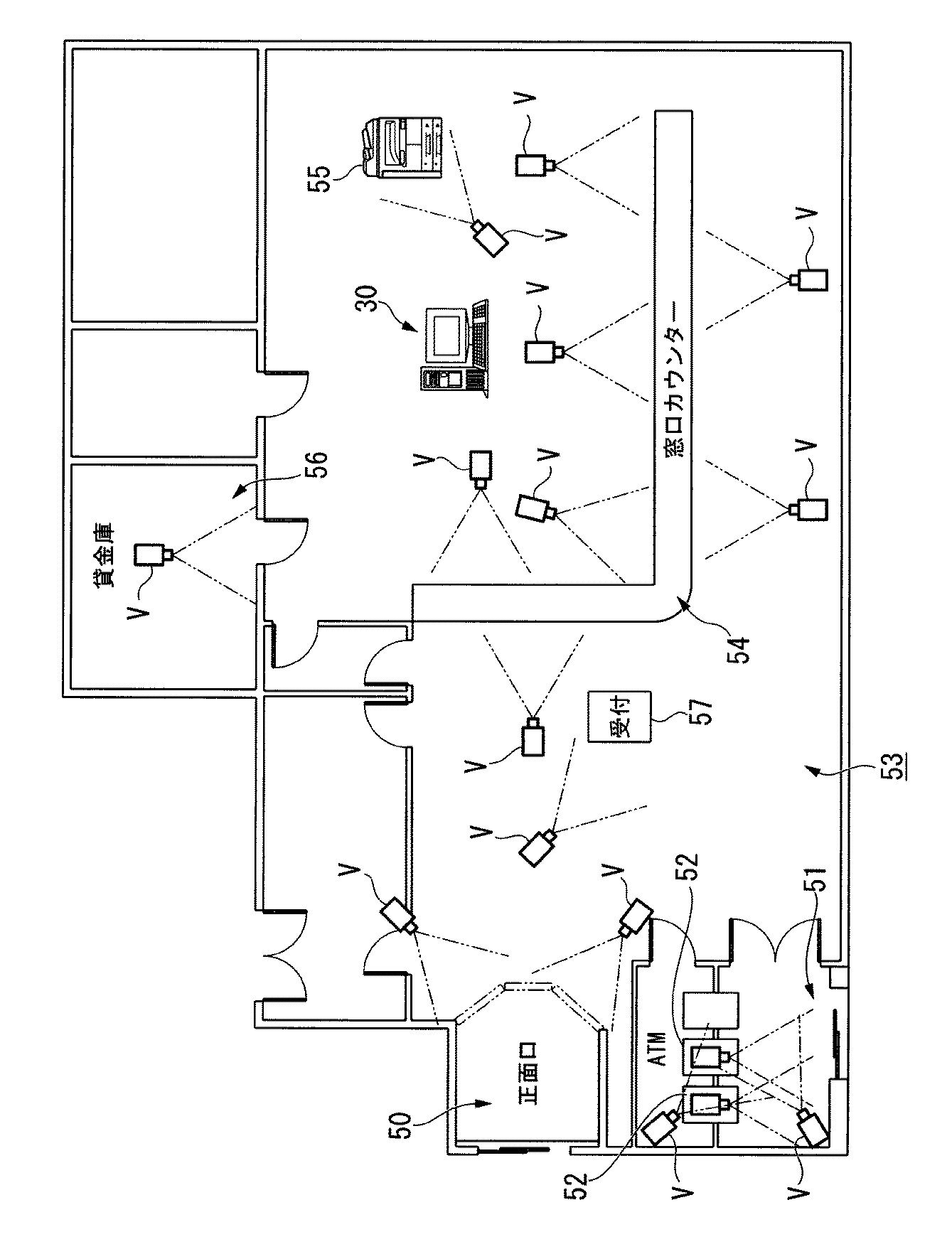 図1は、この実施の形態における行動管理システム10の概略構成を示したものである。この実施の形態の行動管理システム10は、複数のビデオカメラV1〜Vnと、制御装置30、表示部60、操作入力部61とを備えて構成された行動管理装置100が、金融機関などのA店舗〜D店舗にそれぞれ設置されて人物の行動を監視および記録を行う。なお、この実施の形態ではA店舗〜D店舗の4店舗に設置される場合を一例に説明し、これらの各店舗に設置される行動管理装置100はそれぞれ同等の構成であるため、A店舗の行動管理装置100の構成のみ詳細に説明する。