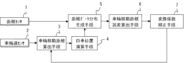 【解決手段】車輪速センサ2から計測されたパルス数に変換係数を乗ずることで車輪の移動距離を算出する車輪移動距離算出手段1と、車輪移動距離から自車両の位置を演算する自車位置演算手段4と、自車両の位置に基づき各距離センサ1によって得られた距離データの分布を各距離センサ1に対し生成する距離データ分布生成手段5と、各距離センサ1の距離データ分布を照合し、車輪の移動距離の誤差を算出する車輪移動距離誤差算出手段6と、車輪の移動距離の誤差に基づき車輪移動距離算出手段3にて用いられる変換係数を補正する変換係数補正手段7を備えている。