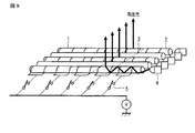 図20に、この場合の走査線の断面の詳細構造を示す。図20に示すように、光導波路2と光取出機能層13との間に第1スペーサ141を配置し、線状体6と第3電極124との間に第2スペーサ142を配置させた構成となっている。第1スペーサ141及び第2スペーサ142を介して両端を接着することにより、光導波路2と線状体6の配置関係を維持できるとともに、光導波路2及び線状体6と走査線にて形状を維持可能な表示面を形成することも可能である。このとき、第1スペーサ141及び第2スペーサ142は、光導波路2に接する面が光導波路2における全反射を妨げないような光導波路2よりも屈折率が低い材料や反射材料であることが望ましい。