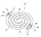 図5に示すように、特許文献1に記載の照明器具に用いられる平面らせん形蛍光ランプ100は、発光管101が、中央部101aを中心として略一平面上で渦巻状に旋回された二重渦巻き形状を有している。そして、略対向して離れた両端部102a、102b間には、発光管101を保持するランプホルダであるブリッジ103が設けられており、ブリッジ103の中央に1個の口金104が設けられている。また、口金104から発光管101の隙間を通って、一対の把持取手105、105が口金104と反対側に突出して設けられている。