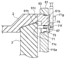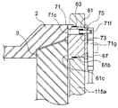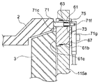 第二ユニット収容穴前方部61eと第二ユニット収容穴後方部61fとの連結部には、個々の開口の大きさの差に応ずる段差として、第一ユニット本体61の前端面61c側に向かう面が第二ユニット用突き当て面61gとして形成される。当該第二ユニット用突き当て面61gと前述した第二ユニット本体71における第二ユニット後端面71dとは、互いに対向するように配置される。また、前述した第二ユニット用弾性部材73は、これら第二ユニット用突き当て面61gと第二ユニット後端面71dとの間に配置される。当該第二ユニット用弾性部材73から受ける付勢力により、無負荷状態にある第二ユニット前方部71aの第二ユニット前端面71c及びその近傍の一部は第二ユニット収容穴前方部61eからはみ出す。即ち、通常状態において、第二ユニット本体71の一部は第一ユニット本体61の表端面61cから突き出すこととなる。なお、第二ユニット用弾性部材73の付勢力により、第二ユニット本体71には常に第二ユニット収容穴から抜けようとする力が加えられる。このため、第二ユニット本体71の抜けを防止するために、第二ユニット後方部71bにおける第二ユニット後端面71dより後方の所定位置には、第二ユニット用係止部材75が配置される。当該第二ユニット用係止部材75は、第二ユニット後方部71bに対して、第二ユニット収容穴後方部61fよりも大きな外形を与えて第二ユニット本体71の第二ユニット用収容穴から外部への抜けを防止すると共に、該第二ユニット本体71の第一ユニット本体61からの突き出し量を規定する。