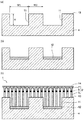 図4は本発明の第2の実施形態に係る化合物半導体発光素子である発光ダイオード21の構造を模式的に示す断面図である。図5はその発光ダイオード21の底面図である。この発光ダイオード21は、前述の発光ダイオード1に類似し、対応する部分には同一の参照符号を付して示し、その説明を省略する。注目すべきは、下記の点である。すなわち、本実施の形態では、各トレンチ11の底部の外周部分の下部、すなわち第1領域Aと第2領域Bとの境界部分に絶縁領域22を有するとともに、前記トレンチ11が(図4の奥行き方向に)帯状に延びて連続して形成されている。そして、それらに対応して、図5に示すように各トレンチ11の領域(各第1領域A)を連続させるように接続する櫛形のn型電極24(第1領域用電極)と、各壁13の領域(各第2領域B)を連続させるように接続する櫛型のn型電極23(第2領域用電極)とが形成されて、n型電極23,24に、個別の電圧および電流が印加されるようになっている。