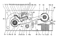 また、昇華型プリンタ100の装置本体90は、図2に示すように、樹脂製の下部用紙ガイド11aと、樹脂製の上部用紙ガイド11bと、ゴム製の給紙ローラ12と、給紙ローラギア13と、ゴム製の排紙ローラ14と、排紙ローラギア15と、巻取リール16と、モータブラケット17と、用紙60(図3参照)を搬送するためのステッピングモータ18と、印字ヘッド2を回動させる際の駆動源となるステッピングモータ19と、揺動可能な揺動ギア20と、複数の中間ギア21〜24(図5参照)と、インクシート51(図1参照)が収納されたインクシートカートリッジ50(図1参照)を支持するカートリッジ支持部25とを備えている。また、装置本体90は、図3に示すように、樹脂製の筐体26の内部に配置されるように構成されている。また、本実施形態による昇華型プリンタ100は、インクシートカートリッジ50と、装置本体90に供給する用紙60を収納するための給紙カセット70とが装置本体90に着脱可能に装着されている。