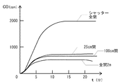 次に、ガレージ2の内部で自動車のエンジンを動作させた場合における、シャッター3の開放幅とCO濃度の時間変化との関係について説明する。図3は、ガレージ2の内部におけるCO濃度の時間変化を示したグラフであり、横軸はエンジン始動からの経過時間、縦軸はガレージ2の内部のCO濃度を表している。この図3には、シャッター3の開放幅を0cm(全閉)、25cm、100cm、200cm(全開)とした場合の各々におけるCO濃度の時間変化が示されている。
