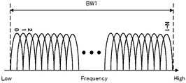 図16は、第3の実施形態に係る基地局3で使用される通信方式を説明するための図である。図16中の符号BW2は、この第3の実施形態で使用される周波数帯域幅である。図17は、第3の実施形態に係る基地局(通信機)3の構成を示したブロック図である。この第3の実施形態では、与えられた周波数帯域幅を、複数の周波数バンド1乃至N(Nは0を除く自然数である)に分割し、分割した周波数バンドごとに、第1の実施形態で説明したOFDM方式を適用する。なお、ここでは、基地局3についてのみ説明するが、この第3の実施形態の基地局3に対応する通信端末の構成および動作は同一である。