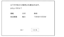 図5(b)は、このように競合の可能性があり、入力された予約情報P0の登録は許容されるが、ユーザへの警告を実施すべき場合の例を示している。この図の例では、予約情報P1は、図5(a)と同様に、毎日7:00から8:00まで放送録画機能を実行することを指定する内容となっている。一方、新たに入力された予約情報P0については、開始時期が毎週月〜金曜日の6:50となっている。そのため、予約情報P0に応じた処理を第2機能実行部22が実際に実行した際に、10分以内に終了しなかった場合、予約情報P1との間で競合が生じ、この処理が途中で中断されることになるが、10分以内に終了すれば、予約情報P1と競合せずにこの処理は正常に終了することとなる。そのため、第2機能実行部22は、予約情報管理部25aによる判定結果に応じて、実行が中断される可能性があることを知らせる警告メッセージをユーザに提示する。これに対して、ユーザがそれでも予約情報P0を登録すべき旨を指示する操作を行った場合には、予約情報管理部25aは、当該予約情報P0を予約情報記憶部23に記憶する。