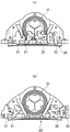 各分割可動装飾片(第2分割可動装飾片)61は、互いに相対動作可能、且つ分離不能な状態で係合し合った複数個の可動装飾小片61A、61B、61Cから成り、各可動装飾小片61A、61B、61Cから夫々突設したピン62をガイドスリット71内に嵌合し、最内径側に位置する可動装飾小片61Aから突設した他のピン63をリンク片72の長穴72aに遊嵌し、最内径側の可動装飾小片61Aの進退動作に他の可動装飾小片61A、61B、61Cを連動させるように構成している。可動装飾小片61A、61B、61Cは、図8(a)、図9(a)に示した展開状態から、図8(b)、図9(b)の中間形態を経て、図8(c)、図9(c)に示した収縮状態に移行する。