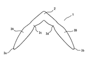 発泡部材61は、頂部2およびこの頂部2からL字状に延出した2つの側壁部63A,63Bを備えており、これらの側壁部63A,63Bを、側壁部63A,63Bの幅方向の途中部から端部63a,63bに向かって厚みが薄くなる形態で形成する。そして、この発泡部材61では、側壁部63A,63Bの内壁に湾曲状の凹部63c,63dが形成しているとともに、頂部62の外壁に、逆三角形状の凹部62aが形成している。なお、凹部62aの深さは、頂部62(又は発泡部材)の厚みに対してごくわずかである。