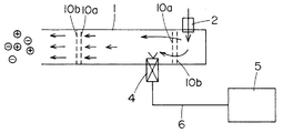 本実施形態は、X線等によるイオン化領域を広げ、発生イオン量を増加させることができるように構成したものである。図9に示したように、本実施形態においては、X線等によるイオン化領域を広げるために、イオン化源4の下流側のチャンバが、イオン化源4の放射角に合わせて円錐状や四角錐状に広げられている。また、遮蔽部は、図2に示した第2実施形態と同様に、直径が3φ程度の細孔11が多数設けられた2枚のパンチング板10a、10bにより構成され、これら2枚のパンチング板10a、10bは、互いに3mm程度離して、且つ細孔11が重ならないようにずらして設置されている。