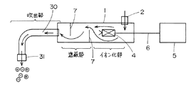 チャンバ1には、前記イオン化部の下流側に遮蔽部が設けられている。この遮蔽部は、例えば図1に示すように、半円状の2枚の隔壁7,7から構成され、これらの隔壁7,7は、チャンバ1の上部と下部とに一定の間隔をおいて交互に形成されている。すなわち、イオン化源4が軟X線の発生部、低エネルギー電子線の発生部又は密封放射性同位元素である場合、直進する軟X線、電子線又は放射性同位元素からの放射線(α線又はβ線)が隔壁7,7に当たるように構成され、それらが外部に漏れないように遮蔽される構成となっている。なお、イオン化源4が紫外線の発生部もしくは沿面放電の発生部である場合は、この遮蔽部は不要である。