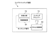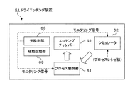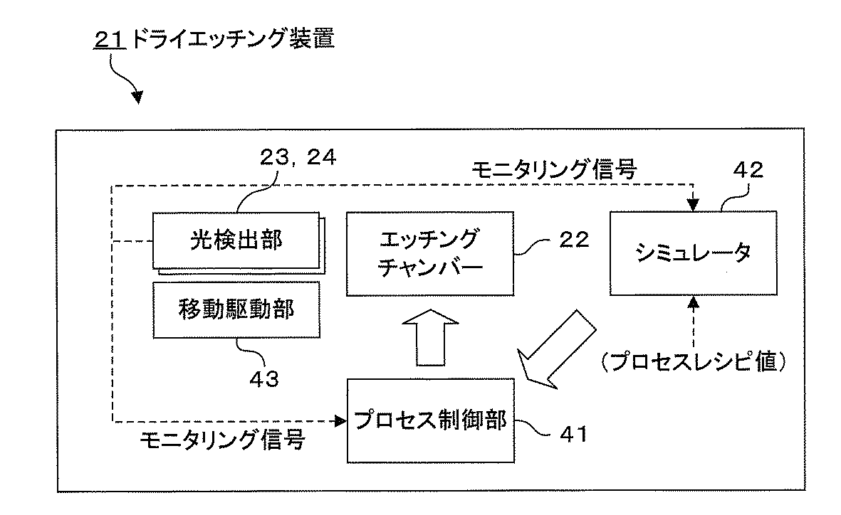 プロセス制御部41は、エッチングチャンバー22に対して、当該エッチングチャンバー22に各種の動作信号を送信することにより、エッチングチャンバー22によって行なわれる処理(本形態例ではドライエッチングプロセス)を制御するものである。また、プロセス制御部41は、エッチング中にシミュレータ42から入力されるシミュレーション結果に基づいて、プロセスパラメータの補正を行なうものである。エッチングプロセスの補正対象となるパラメータとしては、例えば、ガス圧力や基板温度(ウェハ温度)などが挙げられる。光制御部23,24からプロセス制御部41に与えられるモニタリング信号は、エッチングの終点検出に用いられる。エッチングの終点検出に関しては、上記第1の実施の形態と同様にミリ波・サブミリ波のモニタリング信号を用いて行なってもよいし、可視光・赤外線のモニタリング信号を用いて行なってもよいし、両方のモニタリング信号を用いて行なってもよい。