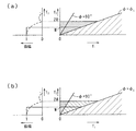 図3は、φ0=0°の場合の振幅および位相の設定領域を示す図である。図3(a)は、振幅設定域を示す図であり、図3(b)は、位相設定域を示す図である。本研究では、ビーム中心φ0=0°とし、焦点位置r0を遠くに設定してビーム端角度φSの小さい超指向性(狭指向性)ビームの形成方法を検討する。φSが小さいと、図3(b)から分かるように、低域から中域にかけての広い範囲で、式(3)による位相の変化が現れるほどの設定とはならず、そのために、焦点形成への寄与も小さく集束不十分なビーム形成となる。そこで、焦点形成を高めるために、非物理領域5を含む低域での位相特性の設定法についての検討を行う。なお、図3(a)に示したf1=fLは、同一指向特性を与える帯域の下端であり、幅2Wの方形振幅が設定される低域の上端とほぼ一致し、次式で与えられる。