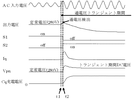 従来の電源装置では、入力電圧の上昇により出力電圧が上昇し、過電圧が検出されることにより出力切り離しスイッチS1をオフにするが、このとき整流回路出力部の正極と負極間の正負端子間電圧Vpnには高いサージ電圧が発生する(図3)。