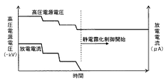 図9は、本発明の実施の第5の形態に係る静電霧化装置の動作を説明するための波形図である。本実施の形態の静電霧化装置にも、前述の図1で示す静電霧化装置の構成を用いることができ、前記制御マイコン7の動作が異なるだけである。本実施の形態は、前述の図7および図8で示す実施の形態に類似している。注目すべきは、本実施の形態では、前記制御マイコン7は、前記高圧電源回路3から霧化電極13への印加電圧を低下させるにあたって、高圧電源回路3を一旦OFFさせるとともに、マイナスイオン放電が検出されなくなってから、さらに1段階印加電圧を低下させた後に、静電霧化放電に移ることである。図9の例では、3段階の電圧低下によって放電電流は前記閾値未満となっており、その後さらにもう1段電圧を低下し、放電電流が流れなくなっている。前記もう1段階低下させるレベルは、たとえば2〜5%である。