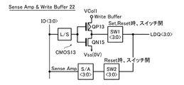 図4及び図11に示されるように、センスアンプ/書き込みバッファ22には、カラム電源線VCol1、ローカルデータ線LDQ<3:0>及びデータ入出力線IO<3:0>が接続されている。まず、書き込みバッファ部分について、その構成を説明する。センスアンプ/書き込みバッファ22に接続されたデータ入出力線IO<3:0>は、レベルシフタL/Sを介してPMOSトランジスタQP13及びNMOSトランジスタQN15からなるCMOSインバータCMOS13に接続される。トランジスタQP13のソースにはカラム電源線VCol1が接続されている。カラム電源線VCol1には後述するように電圧VSETが印加されている。また、トランジスタQN15のソースは接地されている。そして、トランジスタQP13及びQN15のドレインはともにスイッチSW1を介してローカルデータ線LDQ<3:0>に接続されている。