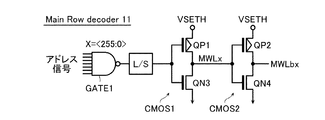メインロウデコーダ11の論理ゲートGATE1の入力端子にも、アドレス信号が供給される。このアドレス信号に基づき、論理ゲートGATE1は、x=<255:0>のうち選択されたx(例えばx=0)について“L”信号を、選択されていないxについて“H”信号をCMOSインバータCMOS1の入力端子に供給する。まず、選択されたx(例えばx=0)について説明する。選択されたx(例えばx=0)の場合、CMOSインバータCMOS1の入力端子には“L”信号が供給され、導通したトランジスタQP1を介して電源VSETHの“H”信号がメインワード線MWL0に供給される。また、メインワード線MWL0の“H”信号は、CMOSインバータCMOS2の入力端子に供給され、導通したトランジスタQN4を介して接地電圧Vssの“L”信号がメインワード線MWLb0に供給される。すなわち、選択されたx(例えばx=0)の場合、メインワード線MWL0には、“H”信号、メインワード線MWLb0には“L”信号が供給される。