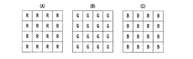 Rフィルタを透過した光成分が光電変換されることにより,赤色の信号成分が得られる。得られた赤色の信号成分によって,図24(A)に示すように赤色成分の被写体像が得られる。同様に,Gフィルタを透過した光成分が光電変換されることにより,緑色の信号成分が得られる。得られた緑色の信号成分によって,図24(B)に示すように緑色成分の被写体像が得られる。Bフィルタを透過した光成分が光電変換されることにより,青色信号成分が得られる。得られた青色の信号成分によって,図24(C)に示すように青色成分の被写体像が得られる。