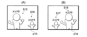(A)に示す被写体像α13には,人物像S15およびS16が含まれている。顔検出処理により人物像S15の顔の部分のスコアは8であり,人物像S16の顔の部分のスコアは4である。(B)に示す被写体像α14には,人物像S17およびS18が含まれている。顔検出処理により人物像S17の顔の部分のスコアは4であり,人物像S18の顔の部分のスコアは6である。人物像S16と人物像S17とは同一の人物を撮像したものである。