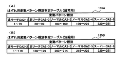 また、この実施の形態では、スーパーリーチを伴う変動パターンを一括りの変動パターン種別としてはずれ用変動パターン種別判定テーブルを構成する場合を示したが、スーパーリーチの種類ごと(例えば、スーパーリーチAとスーパーリーチB)に変動パターン種別を分けてもよい。図43は、はずれ用変動パターン種別判定テーブルにおける判定値の割り当て状態のさらに他の例を示す説明図である。