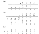 図6は、演算装置1における演算例を示す図である。図6では、十進法で表現された「5×(−6)」の乗算を行う例が示されている。図6(a)で示すように、被乗数に相当する十進法の「5」は、二進法の4ビット整数表記では「0101」であり、乗数に相当する十進法の「−6」は、二進法の4ビット整数表記では「1010」である。そして、図6(a)で示すように、図3および図4のステップS1〜S29における加減算によって、二進法の7ビット整数表記の「0101010」が得られる。また、図6(b)で示すように、図5のステップS31における演算により、二進法の7ビット整数表記のオフセット値「1001000」が算出される。そして、図6(c)で示すように、図3および図4のステップS1〜S29における加減算によって得られた二進法の7ビット整数表記の「0101010」に、オフセット値の2の補数「10111000」が加算されることで、被乗数と乗数との乗算結果「11100010」が得られる。この二進法の8ビット整数表記の「11100010」は、十進法では「−30(=−27+26+25+21)」であり、十進法で表現された「5×(−6)」の乗算が正しく行われていることが分かる。