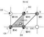 Pattern6の代表点は(12、12)であり、斜め方向パターン代表値qsは、式(20)から、35となる。min(a03b01、c03d01、a03c01、b03d01)=40、max(a03b01、c03d01、a03c01、b03d01)=55の間にないため、Pattern6は無効な斜め方向パターンと判定される。また、Pattern0は、常に有効な(斜め方向)パターンである。