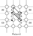 図20を参照して、Pattern2では、第1の元画素群A0、B0、C0、D0で構成される四角形を水平方向に3:1、垂直方向に3:1に内分する四角形(□)で示す位置を代表点とする。斜め方向パターン代表値qsが、線分A0B0を3:1に内分する点A03B01の画素値(a3b1)、線分C0D0を3:1に内分する点C03D01の画素値(c3d1)、線分A0C0を3:1に内分する点A03C01の画素値(a3c1)、および線分B0D0を3:1に内分する点B03D01の画素値(b3d1)の最大最小範囲にあるとき、つまり、min(a3b1、c3d1、a3c1、b3d1)≦qs≦max(a3b1、c3d1、a3c1、b3d1)のとき、Pattern2は、斜め方向パターン代表値qsの条件から有効な斜め方向パターンと判定される。