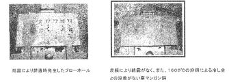 MX溶液を塗布していないコールドボックス鋳型の表面は、黒い煤が付着し(図11の左図)、MX溶液を塗布していないコールドボックス鋳型の表面部分により鋳造した鋳造品(アルミニューム合金)の表面は、くすんでいた。この黒い煤は強く付着しており、擦っても剥がすことはできなかった。