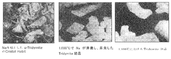 さらに、該組成物は、800℃以上の高温で、黒色の溶融状態の組成物を形成して、物体表面に耐酸化性、耐食性の皮膜を形成する。さらに、アルカリ金属またはアルカリ土類金属の沸点以上では、アルカリ金属またはアルカリ土類金属が除去され、白色、半透明のトリジマイト結晶が得られる。