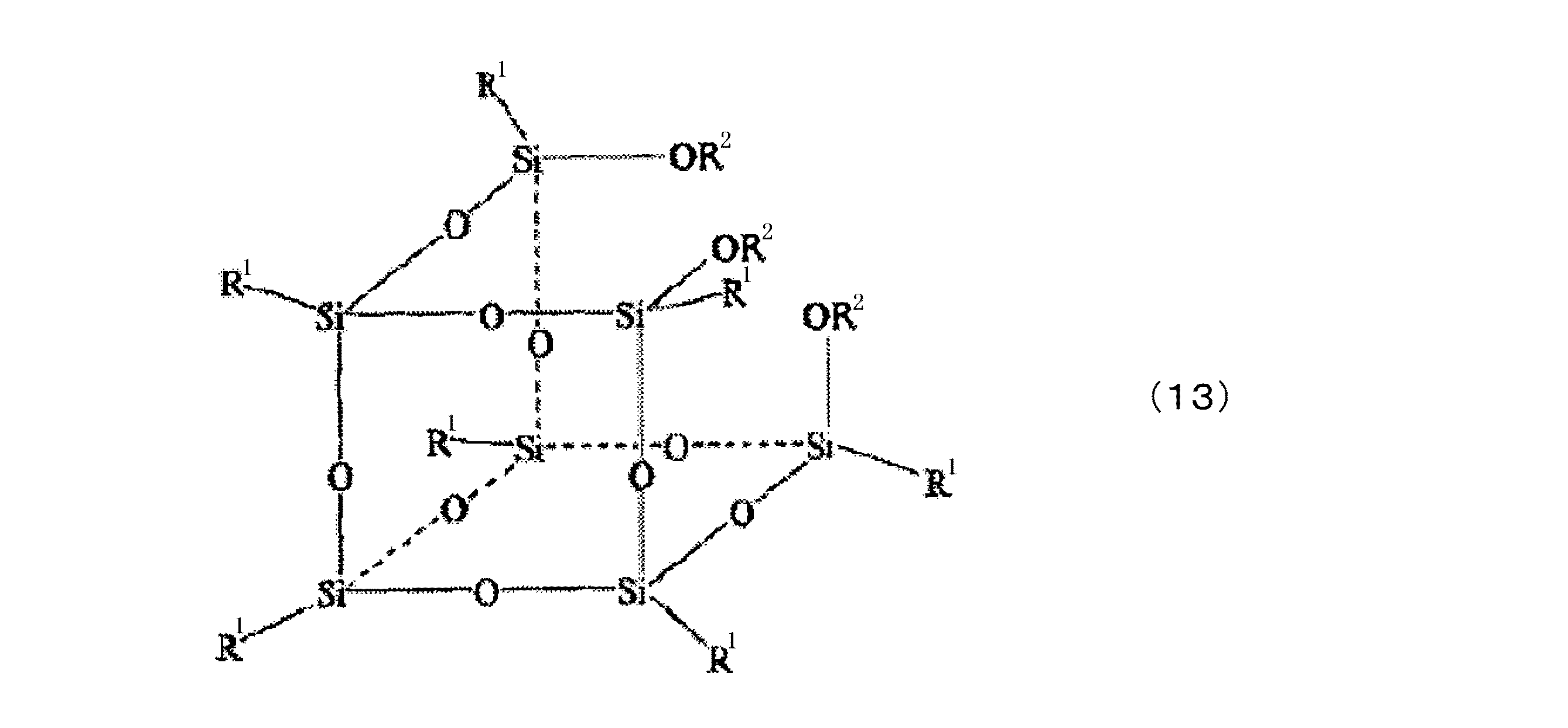 の繰り返し単位を有し、末端基(R2)は、水性溶媒として水のみが用いられれば、水酸基となり、水性溶媒にアルコール又はグリコールが用いられれば、該当するアルコール或いはグリコールのエーテルとなる。なお、アシル化の際にRの全てをアシル化する必要はなく、Rの一部が未反応で残っていてもよい。この場合には、得られたシルセスキオキサンは、R1とともに一部Rが存在する下記一般式(6)および(7)の繰り返し単位を有するアシル化シルセスキオキサンとなる。また、一般式(4)で表されるアシル化トリハロシランとともに一般式(1)で表されるトリハロシランを用いることによっても、下記一般式(6)および(7)の繰り返し単位を有するアシル化シルセスキオキサンが得られる。