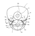 図7の動的油面保持部材8は、立上整流片8aとその下端の下端整流片8bの形状は前記図3におけるものとほぼ同じであるが、立上整流片8aの上端にカウンター軸4,駆動ギヤ6aおよび同期装置6cの外周上方に向かって略水平状に延びる上端整流片8gが形成され、上端整流片8gの先端に、駆動ギヤ6a,同期装置6cの外周上方で略垂下状に延びる垂下片8hが一体形成されている。