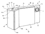 第2側面57bは、レンズ閉塞状態で撮像装置51の右側面を形成し、レンズ開放状態で装置本体2の背面2bと同一の平面となる。第3側面57cは、立上り片58に連続する。また、ベース片57の第2側面57bと第3側面57cによって形成される角部57eは、回動部55を回動させるときに指を引っ掛ける作用部となる。