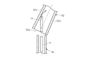メダルシュータ145は、メダルmを起立姿勢のまま初速を与えて投出するためのものであり、図5および図6に表れているように、左右一対の側壁145c,145dおよびこれら側壁145c,145dにつながる底壁145eを、その基本的構成として備え、供給口145aを通じて送り込まれたメダルmを重力の作用により斜め下向きに転動させて加速させる下向きレール部145Fと、先端側メダル投出口145bに向かってメダルmを斜め上向きに転動させる上向きレール部145Gとが、なだらかにつながった構成とされている。メダルシュータ145は、その基端部における側壁145c,145dの間隔が上記送出手段144Aにおける縦壁144b,144cの内面間の間隔よりも大とされており、後述のように垂直軸v1周りに回動させることにより送出手段144Aに対して左右に振った(回動した)状態にしても、送出手段144Aからメダルシュータ145へメダルmを送り出すことが可能となっている。また、メダルシュータ145の先端側の投出口145bは、供給口145aよりも低位に位置している。これにより、メダルシュータ145からのメダルmの投出方向は、水平方向よりも上方に指向されている。