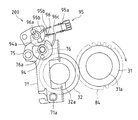 圧接解除装置200は、本実施の形態では、圧力解除カム(偏芯カム)76と、ワンウェイクラッチ77と、揺動レバー78と、揺動用カム(偏芯カム)81とを備え、圧接装置100による加圧ローラ32の定着ローラ31に対する前記第1圧接力と、前記第1圧接力を解除した前記第2圧接力とで自動的に切り替える自動圧接解除手段とされている。