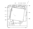 外装101の前面には外扉111が取り付けられている。外扉111の内側には、内扉112が取り付けられている。外扉111を開き、内扉112を開くことによって外装101の前面側に設けられた投入口113を通じて繊維構造体2を回転ドラム120に投入、または回転ドラム120から取り出すことができる。内扉112を閉じ、外扉111を閉じることによって投入口113を塞ぐことができる。内扉112は回転ドラム120内が視認可能なように中央部が透明ガラスで作られているとともに、凹んだ器形状、いわゆる洗面器形状を有している。投入口113側の水槽130の周壁にはゴム等の弾性体からなるドアパッキン114がパッキンカバー115に嵌め込まれて固着されている。内扉112を閉じたときにドアパッキン114が内扉112の周縁に密着して水槽130が密閉される。