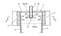 2は浸漬ノズルであり、この浸漬ノズル2を通じて鋳型1の上方に設置されたタンディッシュ(図示せず)内の溶鋼を鋳型1内に注入する。この浸漬ノズル2は、筒状のノズル本体の下端に底部21を有するとともに、この底部21の直上の側壁部に、両鋳型短辺部11と対向するように1対の溶鋼吐出孔20が貫設されている。