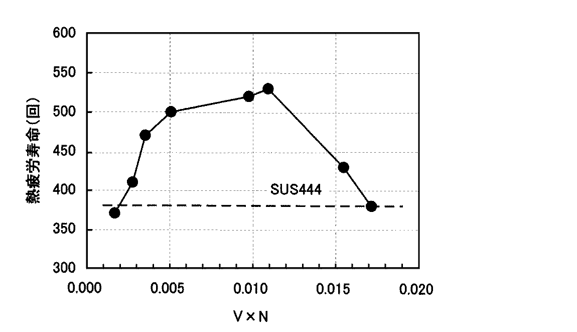 N,Vは、本願発明において、重要な添加元素である。図3〜5に示したように、SUS444より優れた熱疲労特性を得るには、N:0.015〜0.040mass%、V:0.15〜0.60mass%およびそれらの積(V×N):0.003〜0.015の全てを満たす必要がある。N含有量が0.015mass%未満、V含有量が0.15mass%未満あるいは(V×N)が0.003未満のいずれかの場合は、熱疲労特性を向上させる微細なVN析出物が十分生成しないため、目的とする熱疲労特性が得られない。一方、N含有量が0.040mass%超え、V含有量が0.60mass%超えあるいは(V×N)が0.015超えのいずれかの場合は、やはり熱疲労特性が低下する。このような過剰なV,Nの添加は、熱疲労特性の向上に寄与する微細なVN析出物が粗大化して、目的の熱疲労特性が得られなくなるためである。さらに、Vは、図8に示したように、0.15mass%以上の添加で、Cu添加に伴う耐酸化性の低下を改善する効果を有し、Vを0.60mass%以上添加しても耐酸化性に悪影響はない。