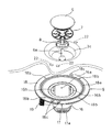 また、ボウル部3aの排水孔3cの外周には、前記排水器具9の各ビス挿通孔18bと整合する位置に複数の下穴23,23,23が予め形成されている。このボウル部3aの裏側に形成される下穴23,23,23は、ボウル部3aの成形時に形成されるため、各下穴23は成形上、同方向に傾斜状に形成されている。