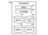 次に、認証管理装置400の構成について説明する。図5は、認証管理装置400の構成を機能概念的に示すブロック図である。認証管理装置400は、通信部401、DB管理部402、認証データベース(以下「認証DB」)410、登録データベース(以下「登録DB」)420、コンテンツデータベース(「コンテンツDB」)430、及び利用データベース(「利用DB」)440を備えて構成されている。