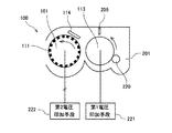 このとき、トナー補給ローラ113には、第一電圧印加手段221によって供給バイアスが印加されている。トナー担持体101には、第二電圧印加手段222によって電極111に電圧が印加されている。したがって、トナー担持体101と対向する位置においては、第一、第二電圧印加手段221、222によってトナー担持体101とトナー補給ローラ113との間に電界が生じ、その電界からの静電気力を受け、トナーはトナー補給ローラ113から分離し、トナー担持体101表面に移動する。
