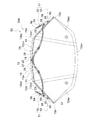 なお、図10乃至図19には図示しないが、折畳み式帽子本体部50Aの表面側において、取付リベット62a及び62b、又は、取付リベット62c及び62dには、バンド75a,75bが係止されている。このバンド75a,75bはいずれも柔軟性のある樹脂にて形成され、両端部には取付リベット62,62,62c,62dのうち何れか一つに係止可能な係止孔部がそれぞれ一つ設けられている。
