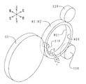 次に、メインロール回転装置の動きについて説明する。まず、図7に示すように、モータ41を駆動し、駆動軸41aを軸周りに回転させる。駆動軸41aは、ギアボックス42内部の減速ギア(図略)と噛合している。また、減速ギアは、回転軸43に連結されている。このため、回転軸43からは、駆動軸41aの回転数およびトルクに対して、低速かつ高トルクの回転力が出力される。当該回転力により、回転軸43に固定されたメインロール60を回転させる。なお、メインロール回転装置4は、揺動部32に固定されている。このため、揺動部32が揺動する際、メインロール回転装置4も揺動部32と共に揺動する。