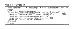 図8の1番目の枠内は、中継グループ情報42を示す。上位情報421は、上位にある中継グループについての情報である。「id」として、「20070402133100@relay−server−1.abc.net」が設定されている。「lastmod」として、「20070402133100」が設定されている。「name」として、「GROUP 1」が設定されている。