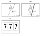 図15は、大当たり抽選において「長当たり」に当選した場合の画像表示器8における演出表示の一例を示す図である。尚、この場合、画像表示器8において装飾図柄の変動表示を開始してからリーチ状態となるまでの表示態様は図13(a),(b),(c)と同様である。そしてリーチ演出中に上述したように第1役物23に向かうライン状の演出表示が行われる。例えば画像表示器8の画面が図柄の変動表示から切り替わり、図15(a)に示すようにバトンを持ったキャラクタ画像が表示される。そして図例の如く、キャラクタがバトンを画面右上に振り上げると、図6に示した第1の一次ランプ表示部31の点灯部71aが点灯し、その後、複数の点灯部71a〜71hが画像表示器8に向かって順次点灯していき、遊技盤1の右上部分から画像表示器8に向かう略線状の点灯表示が行われる。そして第1の一次ランプ表示部31において最後の点灯部71hが点灯すると、画像表示器8では図15(b)に示すようにキャラクタがバトンを画面中央下に振り下げる画像を表示する。このとき、バトン先端の軌跡がライン状の画像として表示される。そしてキャラクタがバトンを振り下げる動作を表示した後、図6に示した第1の二次ランプ表示部35の点灯部75aが点灯し、その後、複数の点灯部75a〜75fが順次点灯していき、画像表示器8の画面中央下に対応する部分から第1役物23に向かう略線状の点灯表示が行われる。したがって、この場合は、図16に示すように、第1の一次ランプ表示部31による略線状の点灯表示D1と、画像表示器8におけるライン状の画像表示D2と、第1の二次ランプ表示部35による略線状の点灯表示D3とで第1役物23に向かうライン状の演出表示が行われ、遊技者を第1大入賞口22や第1役物23に注目させることができると共に、第1役物26が第1大入賞口25を開放することを、リーチ演出中に、遊技者に期待させることができる。そしてこのようなライン状の演出表示が行われた後、図15(c)に示すように画像表示器8の装飾図柄は「777」で停止する。尚、ここでは第1の一次ランプ表示部31が点灯する場合を例示したが、第2の一次ランプ表示部32が点灯して第1役物23に向かうライン状の演出表示を行っても良い。