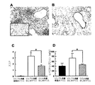 ビヒクル処置食塩水マウスの肺との比較において(図3Aの挿絵)、ヘマトキシリン−エオジン染色したビヒクル処置BLMマウスの肺から、肺胞中隔の顕著で無秩序な肥大を伴う、上皮下領域および胸膜下領域への重度の炎症細胞浸潤が起こり、正常な構造が喪失していたことが明らかになった(図3A)。しかしながら、GAA処置BLMマウスでは、間質浸潤および気腔の細胞充実度の有意な低下が示され、その組織学的変化は、ビヒクル処置BLMマウスとの比較において、より程度の小さいものであった(図3B)。肺損傷の定量的な組織学的スコアリングでは、ビヒクル処置BLMマウスのスコア(3.3±0.5)が、GGA処置BLMマウスのスコア(1.7±0.2)より有意に高いことが示された(図3C)。肺のコラーゲン含有量が、線維症と関係することから、ヒドロキシプロリンの測定も行った。ヒドロキシプロリン量は、ビヒクル処置BLMマウスとの比較において、GGA処置BLMマウスで有意に少なかった(それぞれ、ビヒクル処置BLMマウス;72.5±18.8μg/ml、GGA処置BLMマウス;45.3±3.5μg/ml)(図3D)。