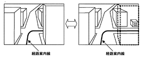 上記参考例では経路案内中の右左折すべき交差点に車両が近づいた場合に、拡大3次元地図表示をするとともに、手前に表示される建物を車速に応じた間隔で点滅させていた。これは3次元地図表示の趣旨をできるかぎり失わないようにしつつ、どのような車速であっても曲がった先の地形を容易に確認できるようにするためである。